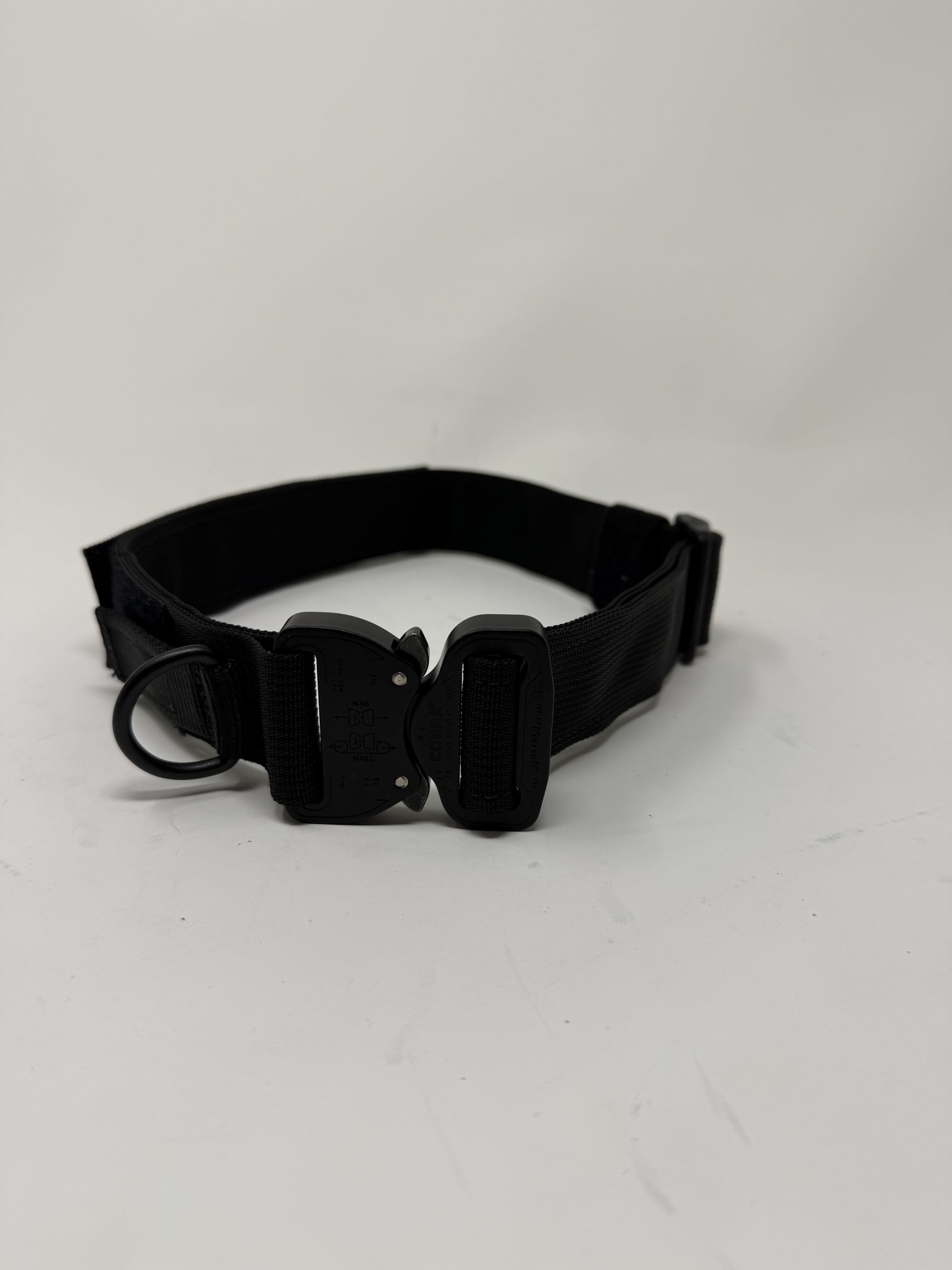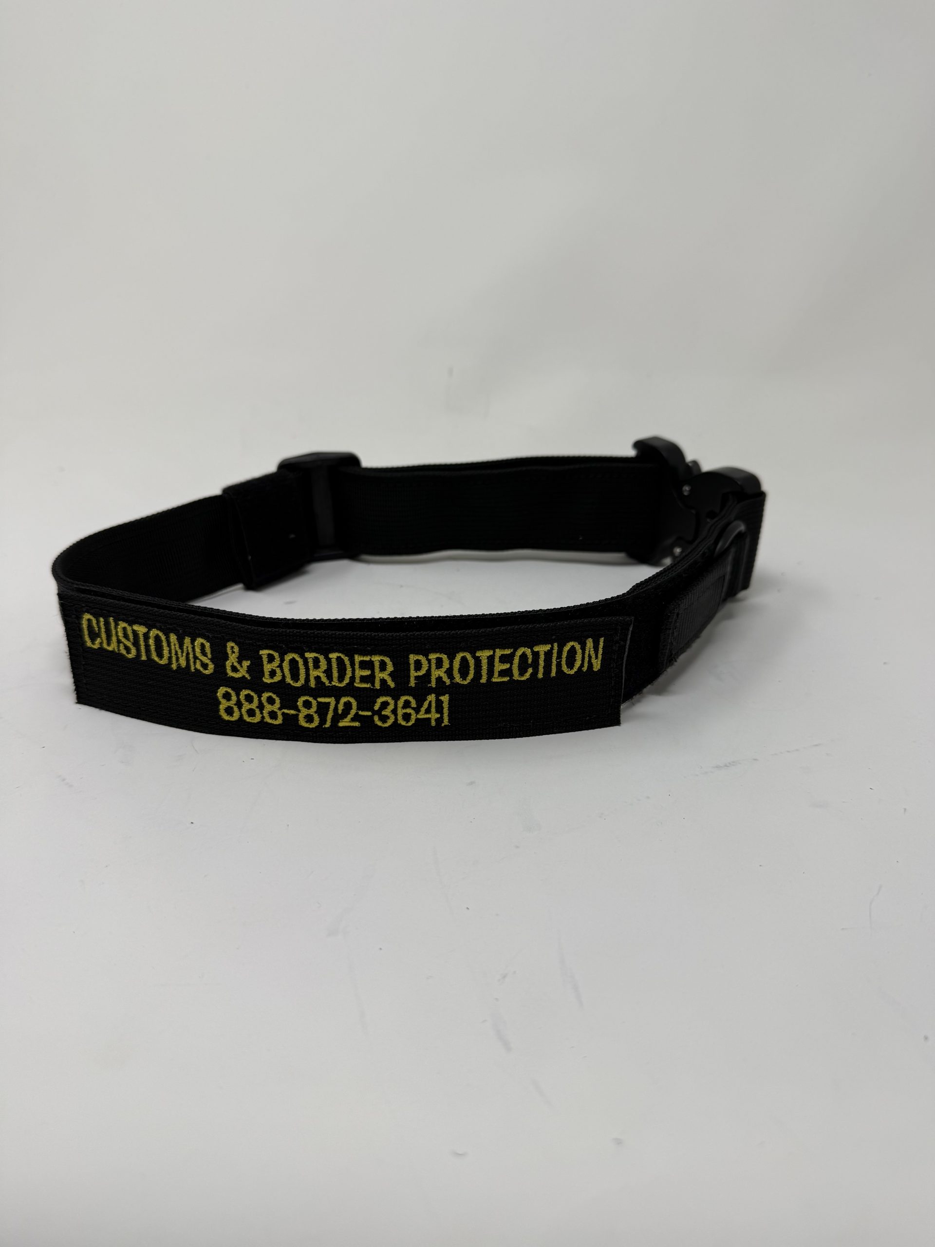 Specialty collars for explosives detection work could also be used as general purpose collar. lightweight collars. D-ring can be tabbed down for off- line searches, has 8” velcro strip for a patch. Made with Military spec webbing and metal Cobra buckles.